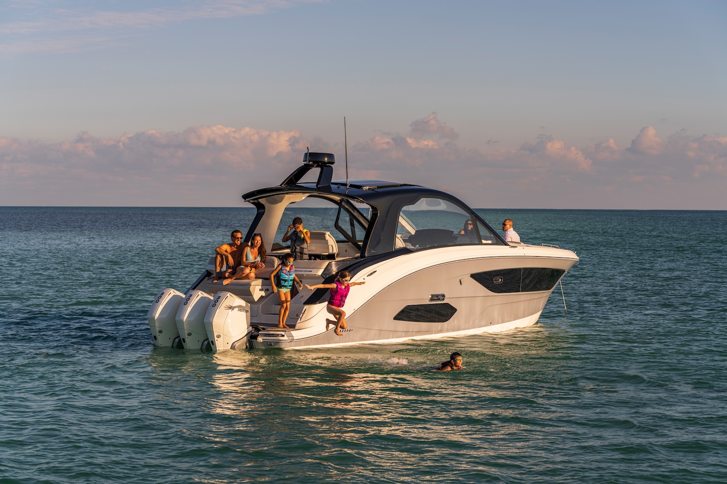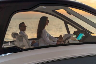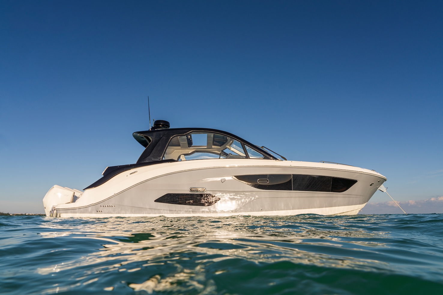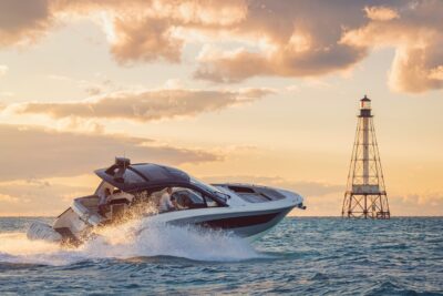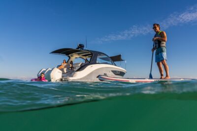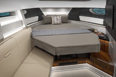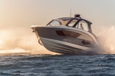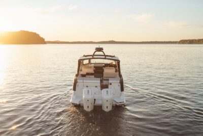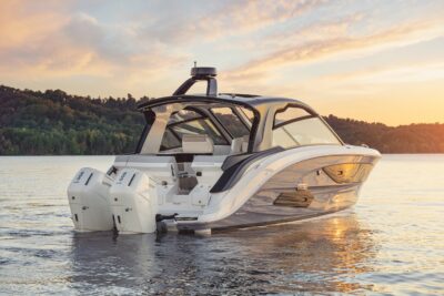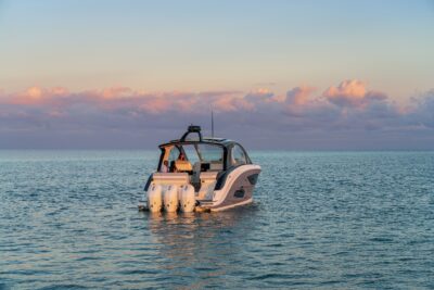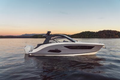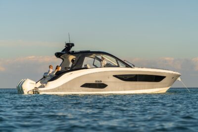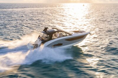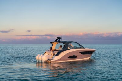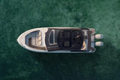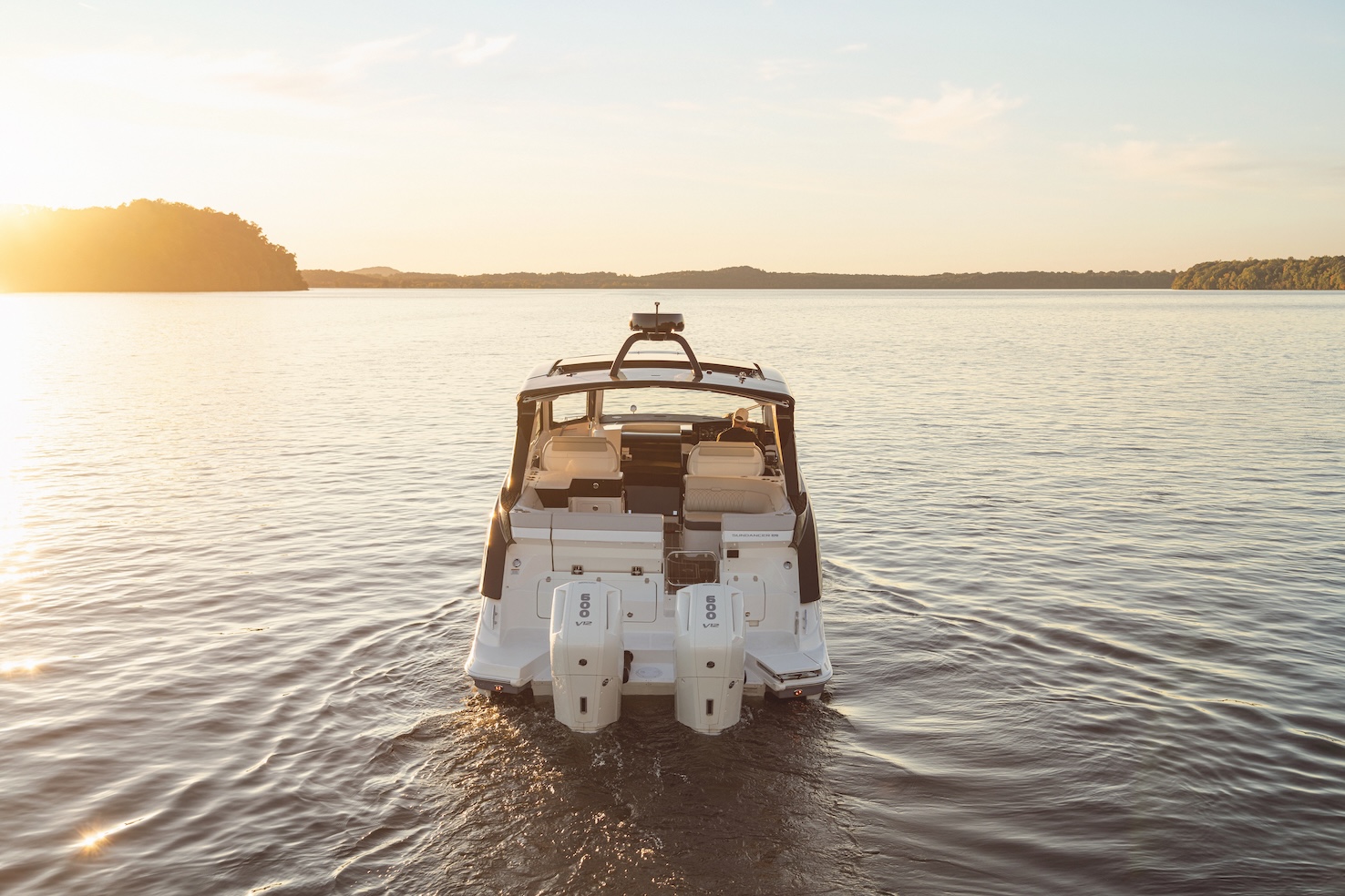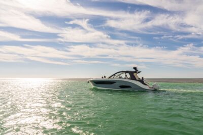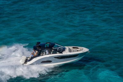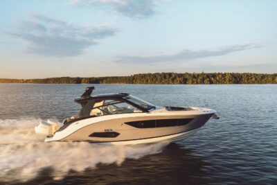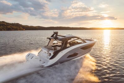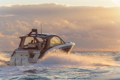 Przedstawiamy największy model z linii Sundancer amerykańskiej stoczni Sea Ray. Model ten, podobnie jak jego mniejszy brat SR320, charakteryzuje się nowatorskim zaprojektowaniem przestrzeni dziobowej. Dzięki przejściu na dziób usytuowanemu na portburcie, zamiast klasycznych półpokładów, zyskujemy przede wszystkim bardzo dużo miejsca w kokpicie, gdyż cała szerokość łodzi wykorzystana jest wówczas maksymalnie. Bardzo wygodne trzy leżanki dziobowe to znak rozpoznawczy linii Sundancer. Wszystkie przestrzenie głównego pokładu są na tym samym poziomie co znacznie ułatwia komunikację. Przestronny kokpit z aneksem kuchennym, leżankami i hardtopem w połączeniu z dziobem tworzą jedną z najatrakcyjniejszych przestrzeni życiowych spośród wszystkich łodzi tej klasy na światowym rynku. Pod pokładem znajdują się dwie przestronne kabiny przekształcane w wygodne sypialnie oraz obszerna łazienka z osobnym prysznicem.