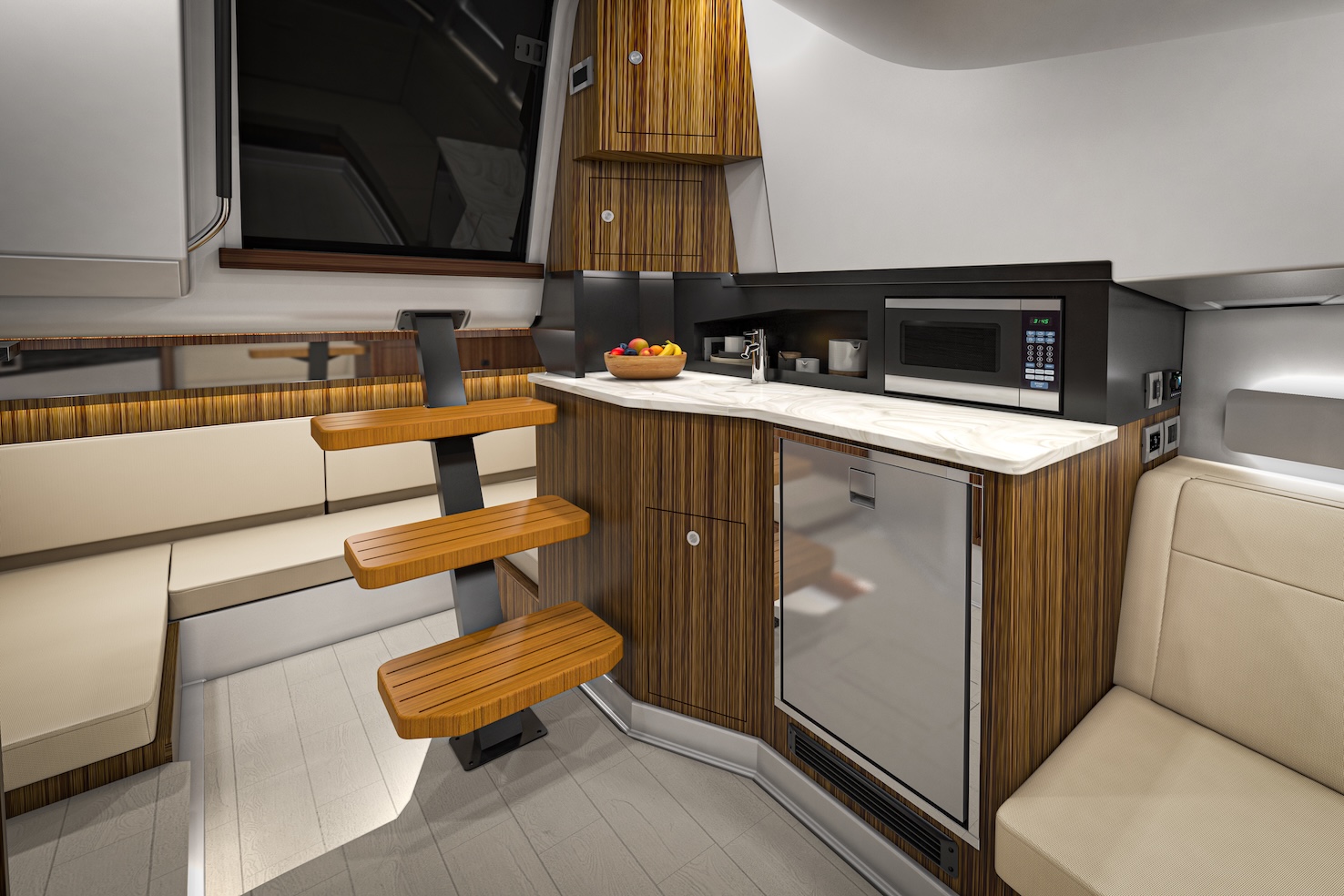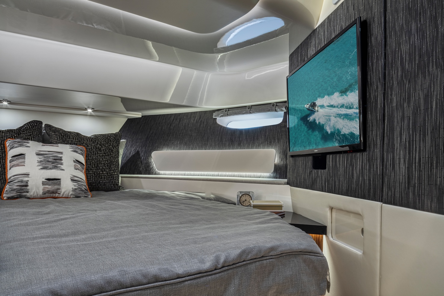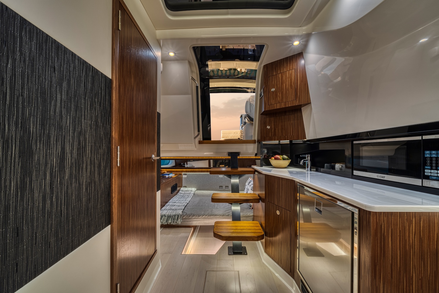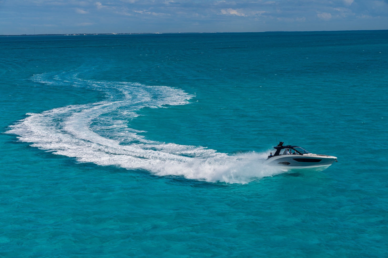 Przedstawiamy największy model z linii Sundancer amerykańskiej stoczni Sea Ray. Model ten, podobnie jak jego mniejszy brat SR320, charakteryzuje się nowatorskim zaprojektowaniem przestrzeni dziobowej. Dzięki przejściu na dziób usytuowanemu na portburcie, zamiast klasycznych półpokładów, zyskujemy przede wszystkim bardzo dużo miejsca w kokpicie, gdyż cała szerokość łodzi wykorzystana jest wówczas maksymalnie. Bardzo wygodne trzy leżanki dziobowe to znak rozpoznawczy linii Sundancer. Wszystkie przestrzenie głównego pokładu są na tym samym poziomie co znacznie ułatwia komunikację. Przestronny kokpit z aneksem kuchennym, leżankami i hardtopem w połączeniu z dziobem tworzą jedną z najatrakcyjniejszych przestrzeni życiowych spośród wszystkich łodzi tej klasy na światowym rynku. Pod pokładem znajdują się dwie przestronne kabiny przekształcane w wygodne sypialnie oraz obszerna łazienka z osobnym prysznicem.